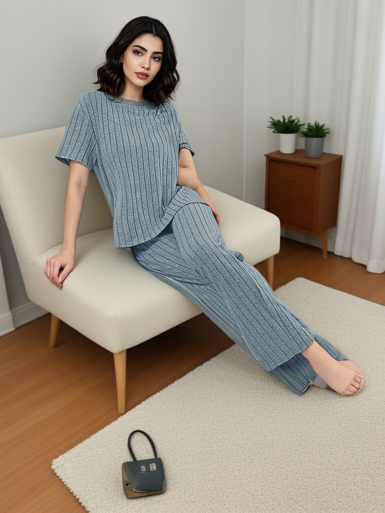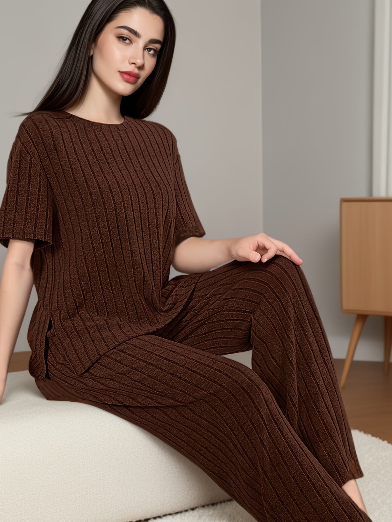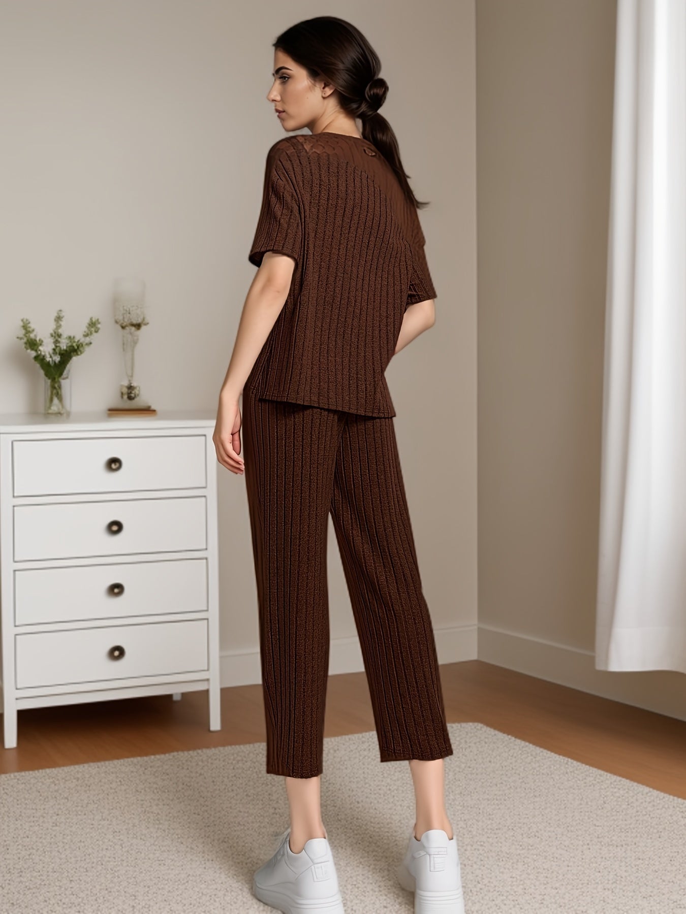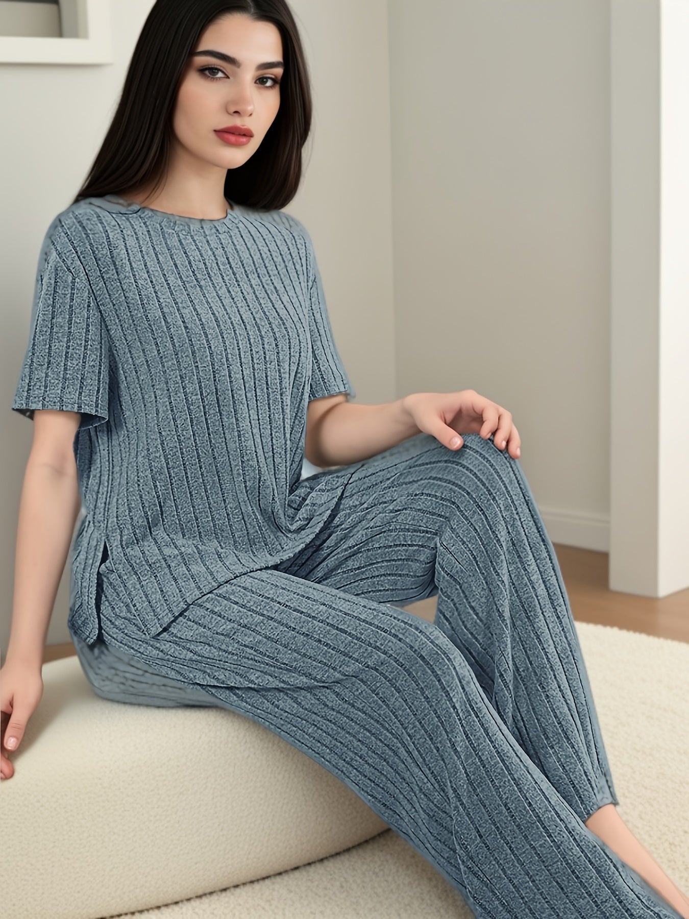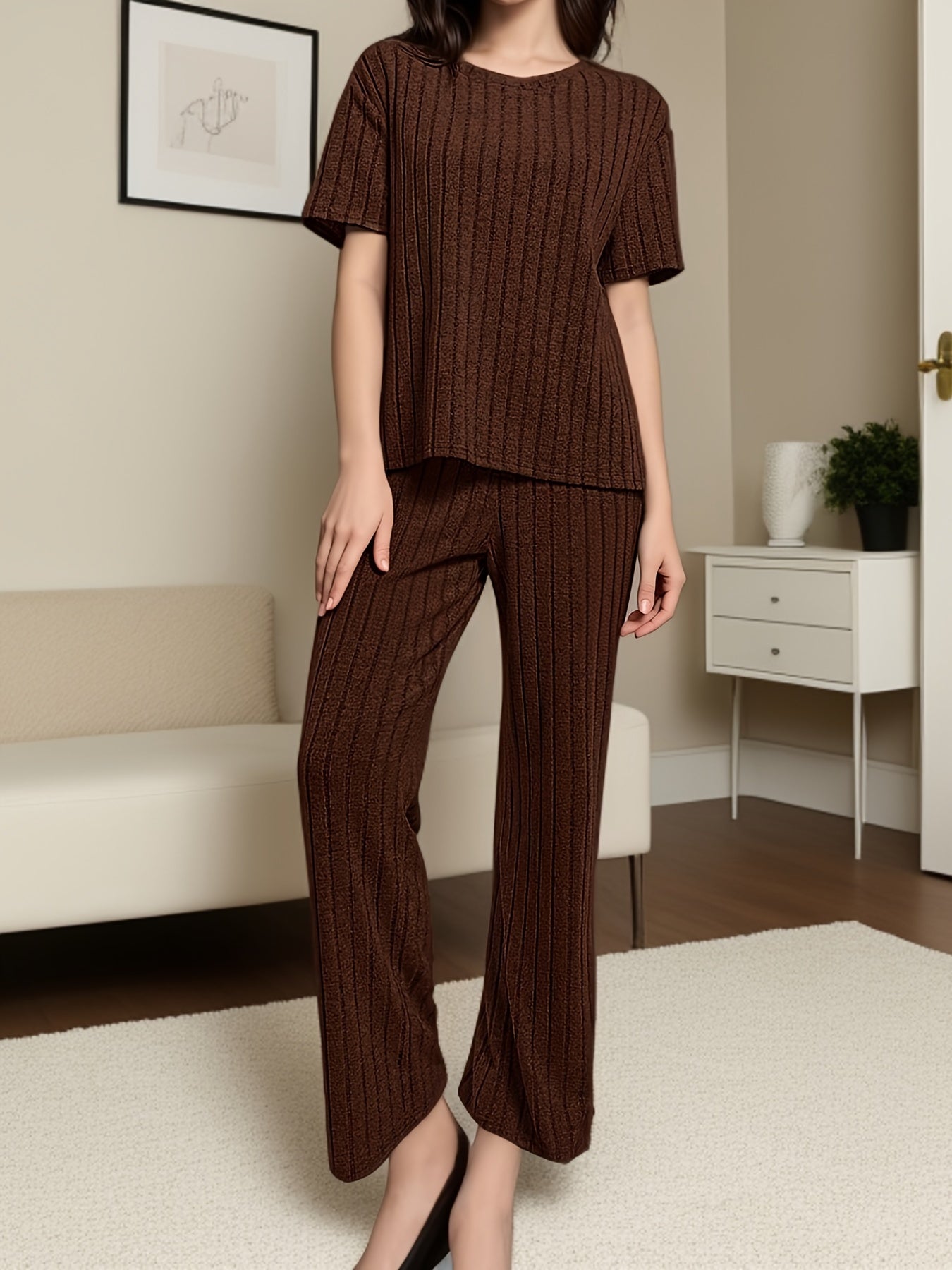 Women's Solid Ribbed Elegant Loose Fit Lounge Set, Short Sleeve Round Neck Top & Pants, Comfortable Relaxed Fit