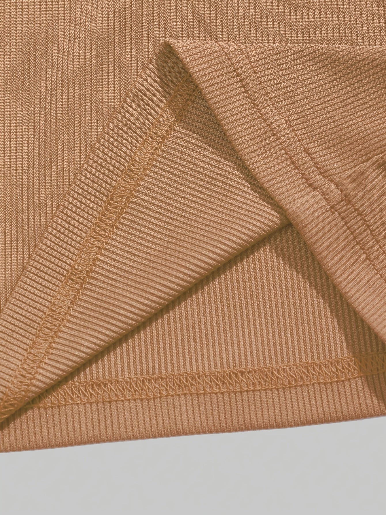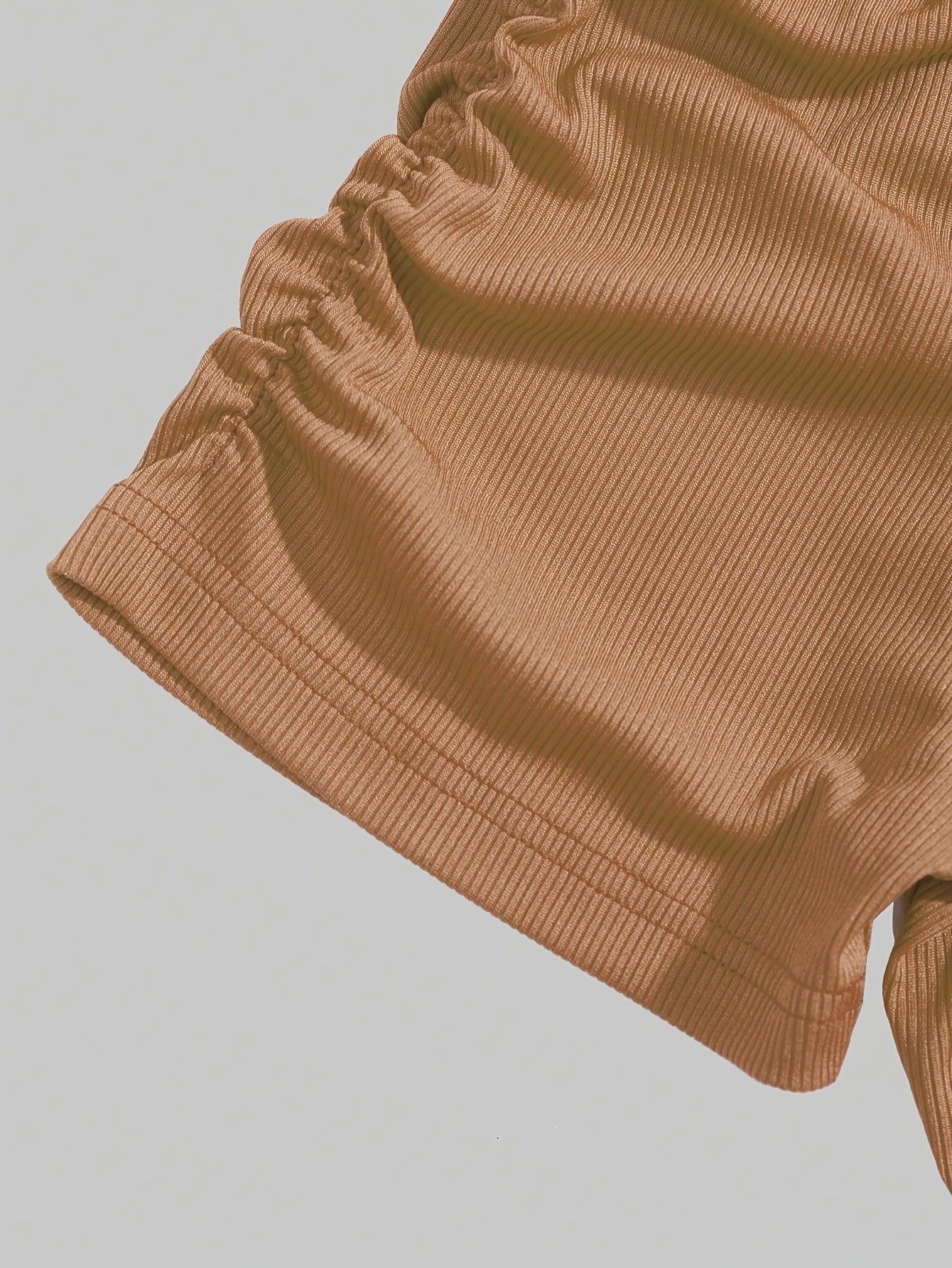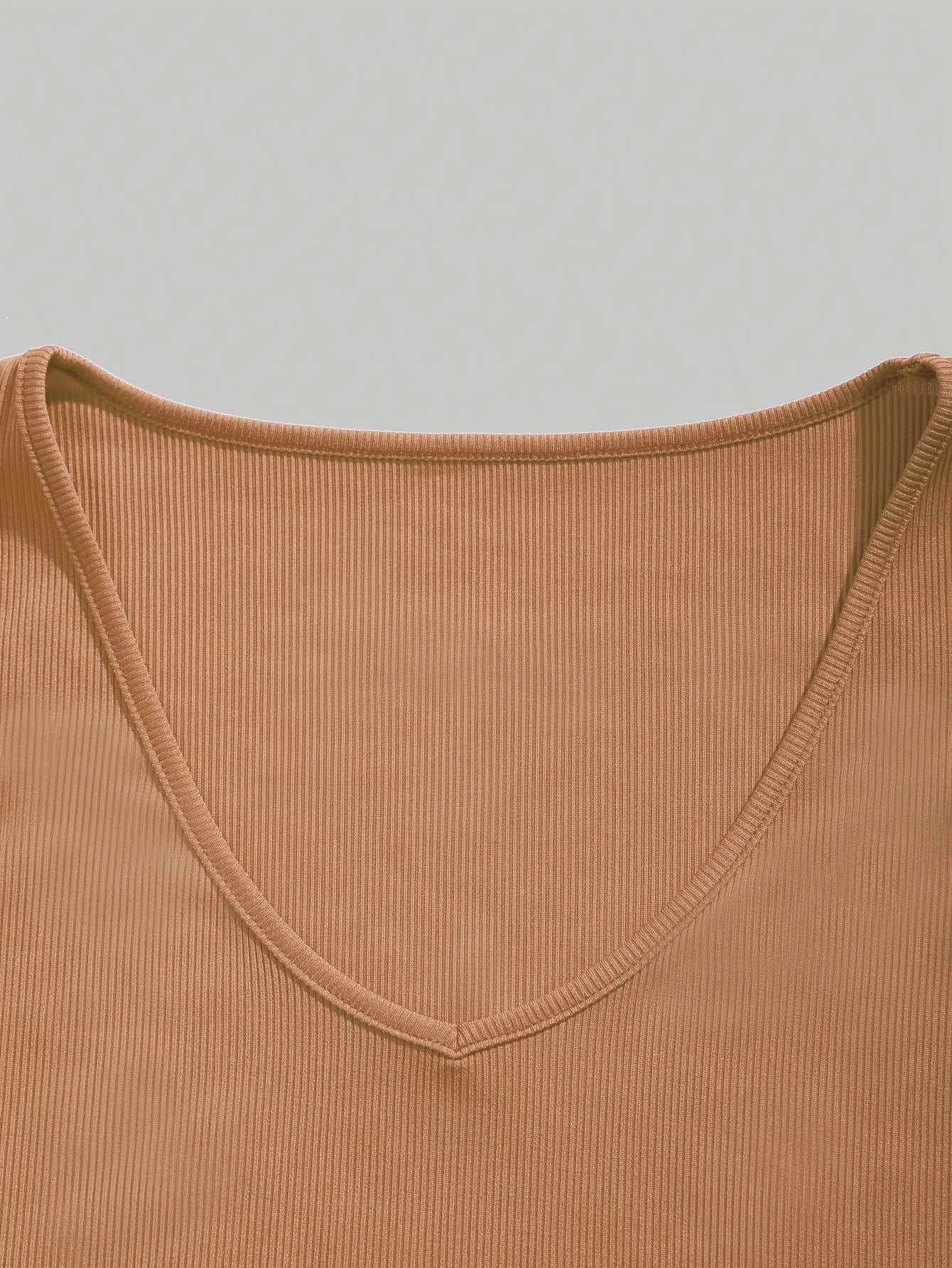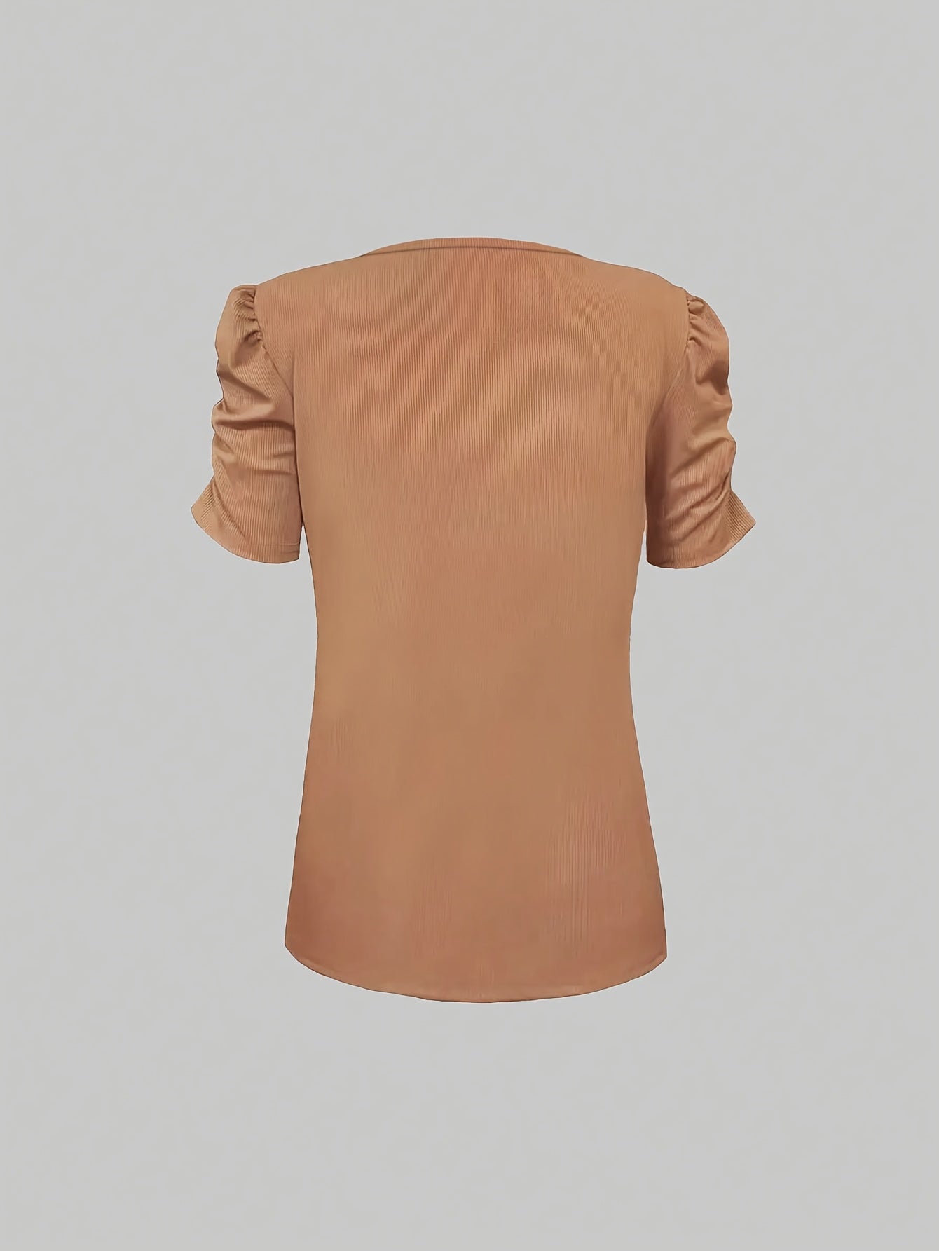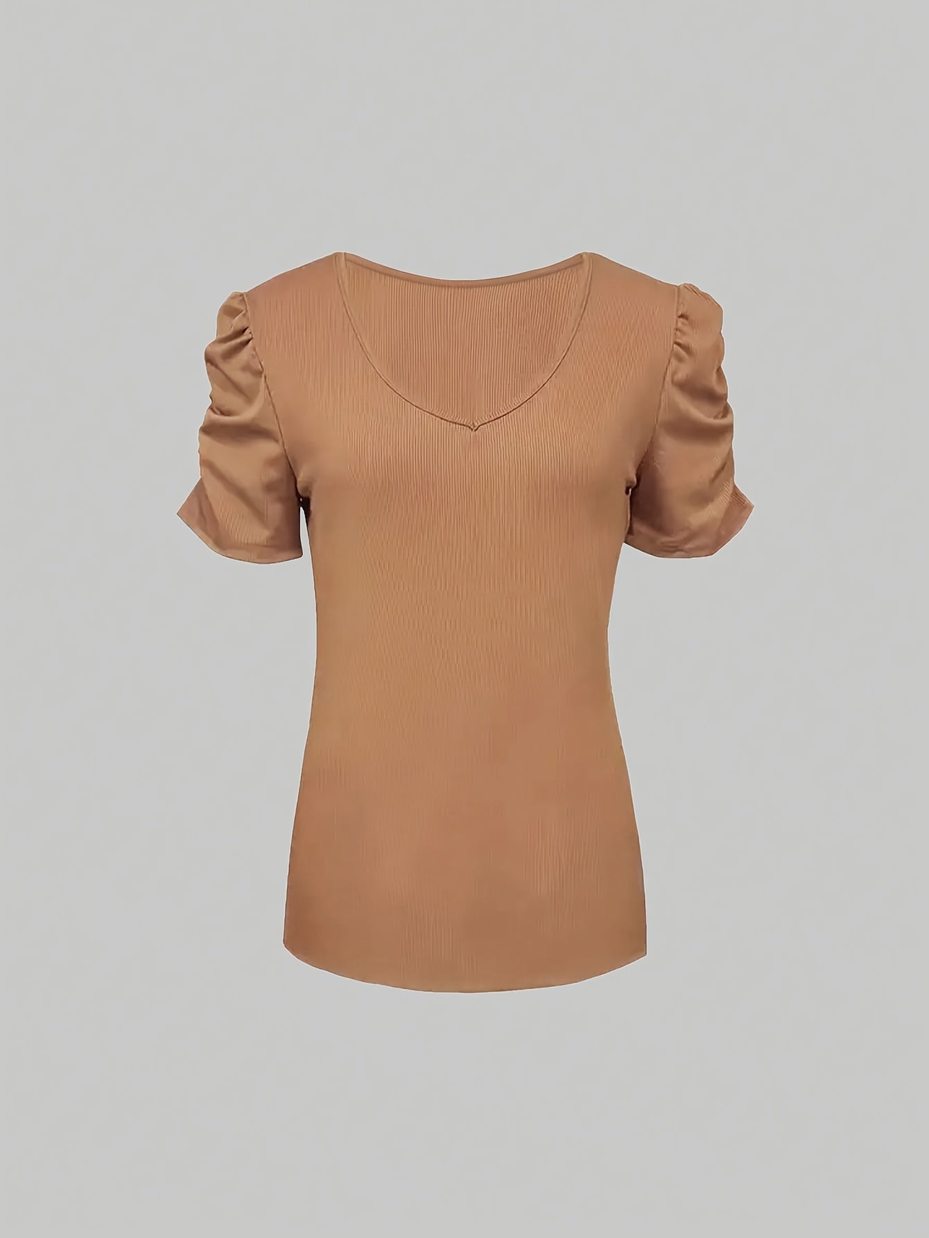 Women'S Stretchy V-Neck Ribbed Crop Top - Beige Casual Summer Blouse with Puff Sleeves, High Waist White Pants & Golden Belt, Stylish Layering Piece, Crop Top Blouse