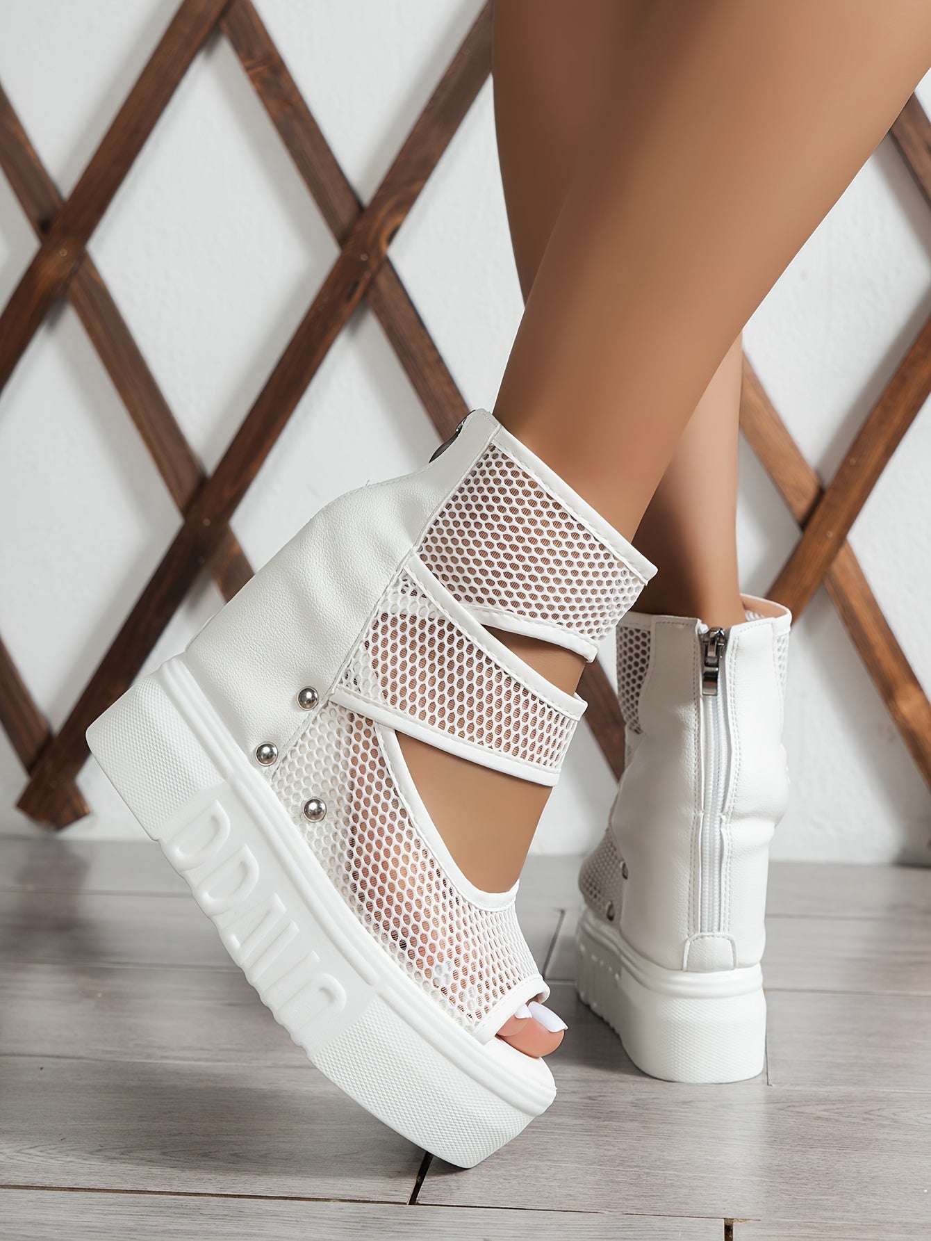 Women's Stylish Solid Color Sandals, Back Zipper Platform Soft Sole Studded Wedge Sandals, Mesh Breathable Vacation Shoes