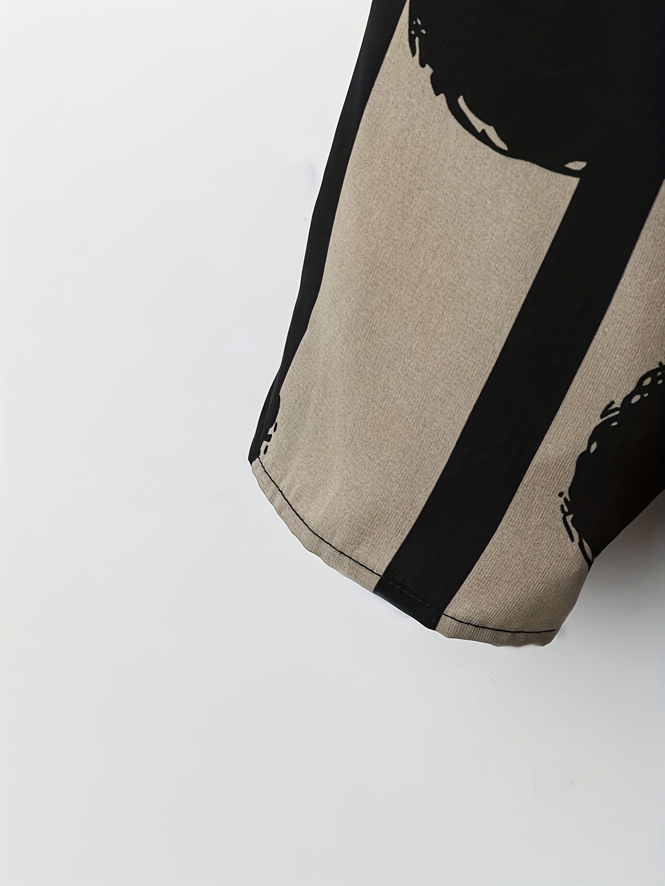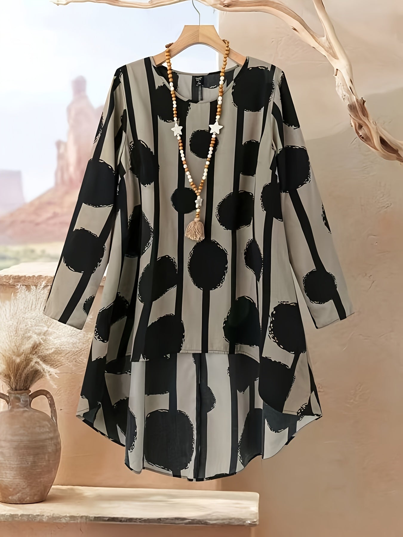 Women's Two-Piece Set with Geometric Pattern Round Neck Long Sleeve, Loose Hem Front Short Back Top and Pants, Casual Style, Summer/Autumn Wear, Mid-Length Tops, Solid Color Trousers, Long Sleeve Outfit