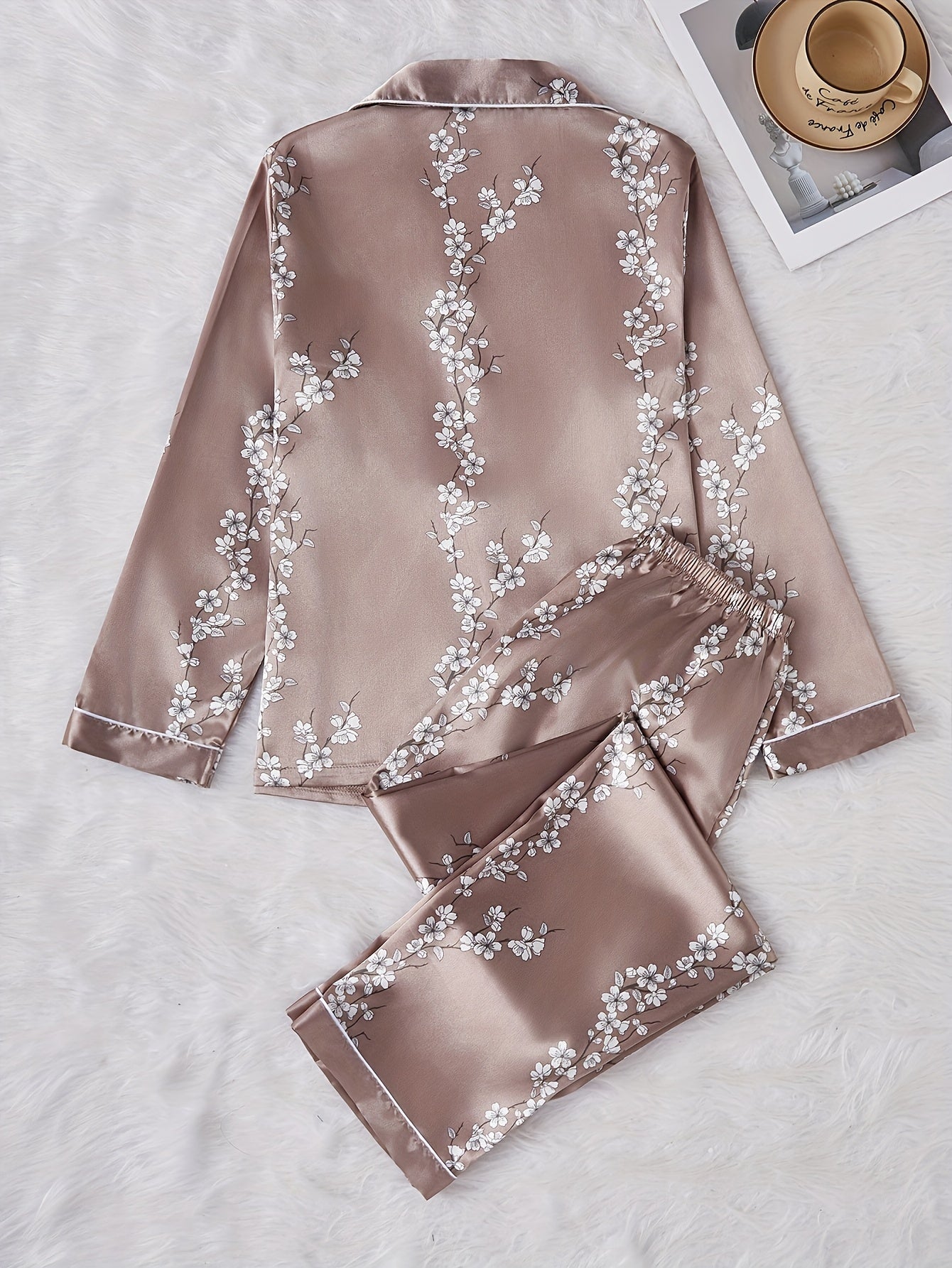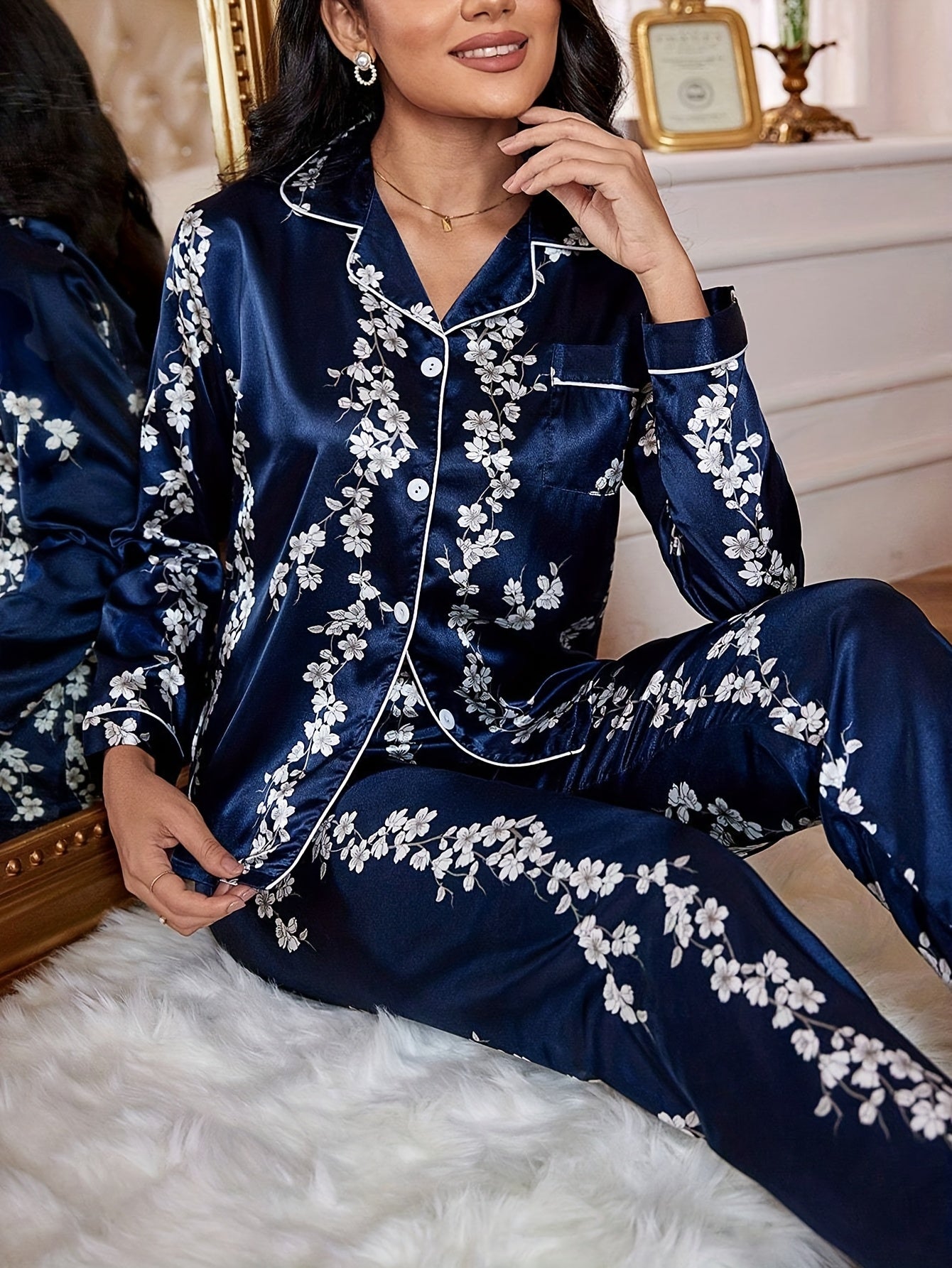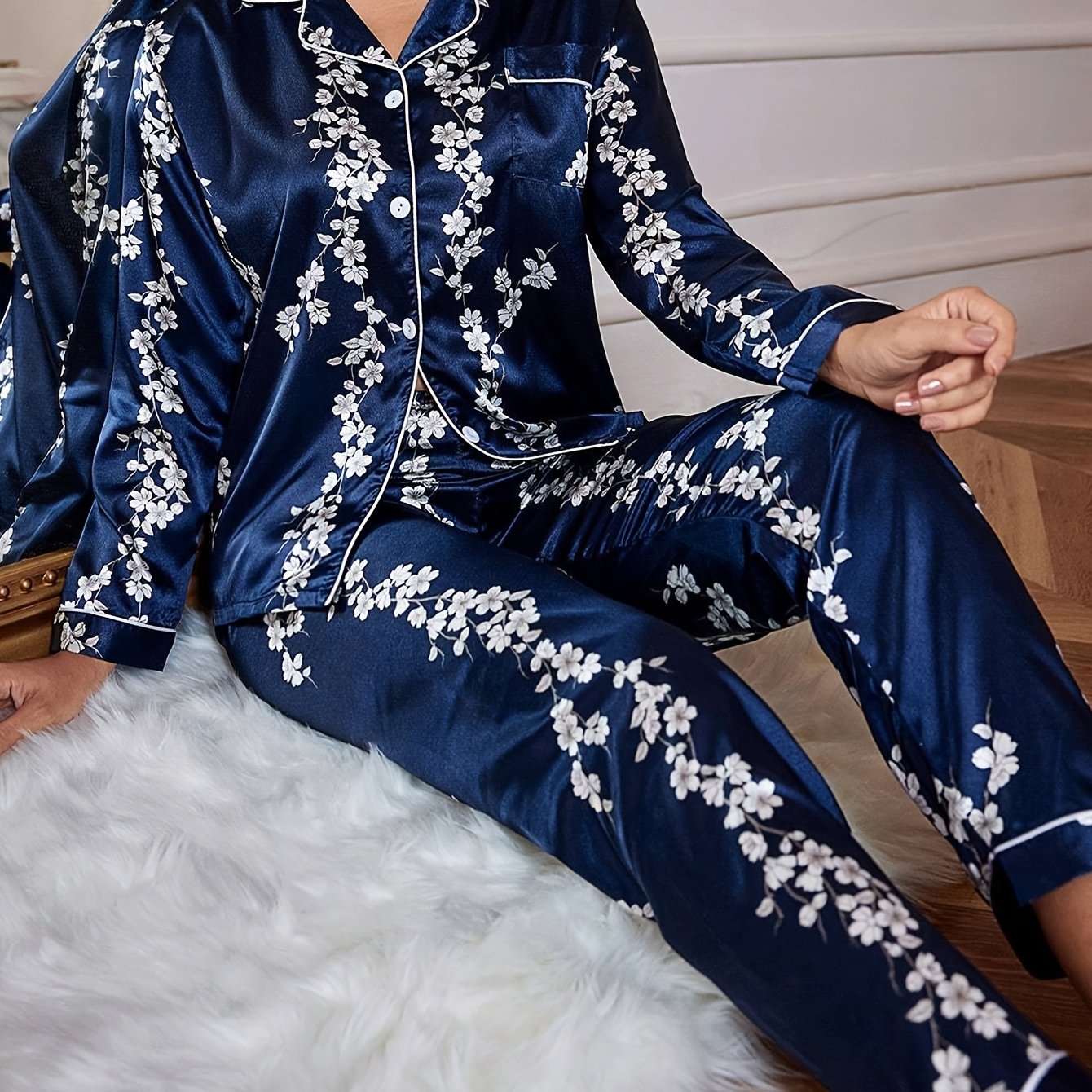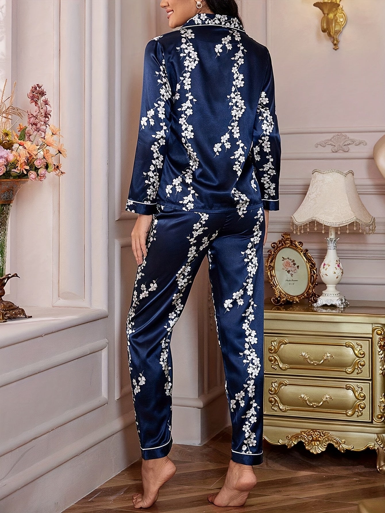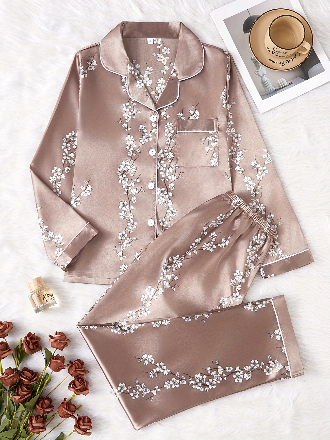 Women'S Vintage Elegant Floral Print Satin Pajama Set, Long Sleeve Top and Pants, Polyester 97% Elastane 3%, Lapel Collar, Woven, 90gsm, Fall/Winter Sleepwear