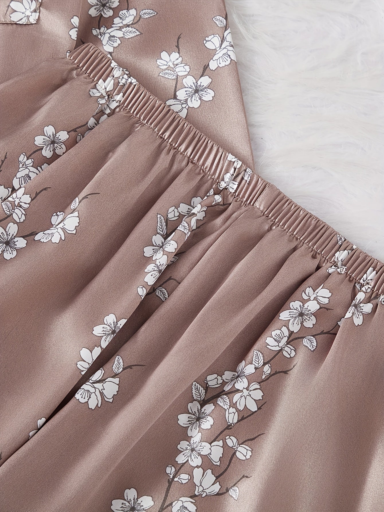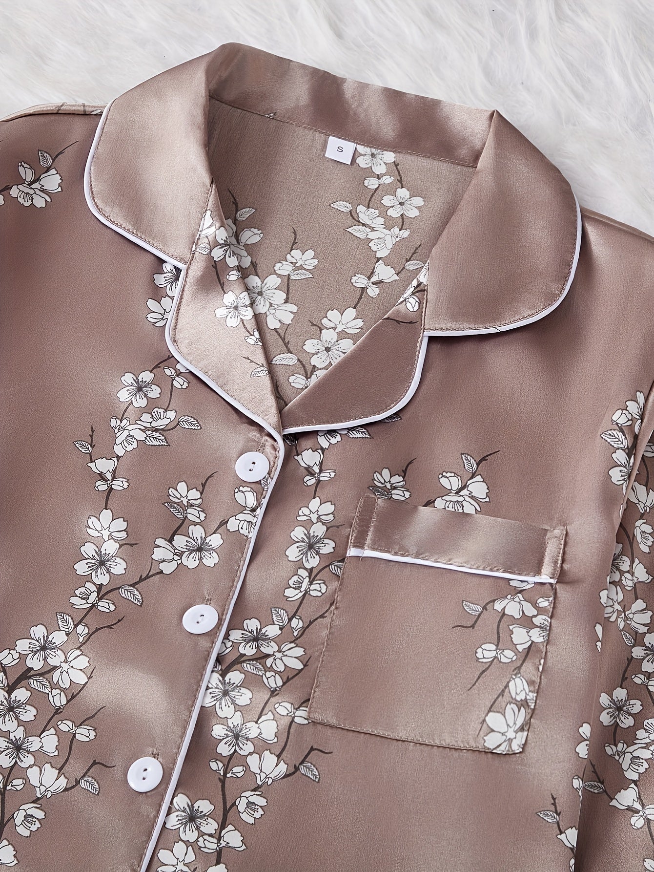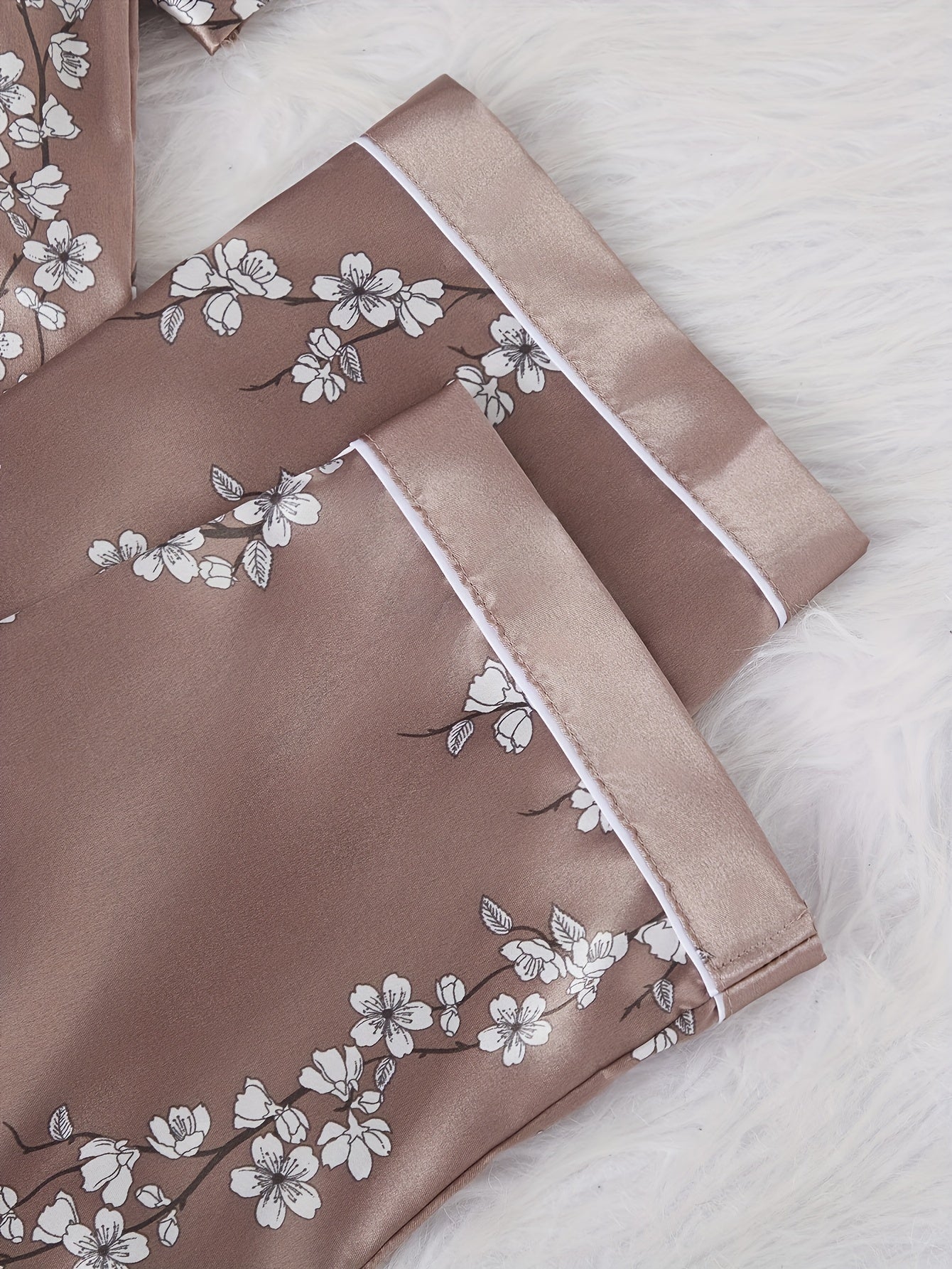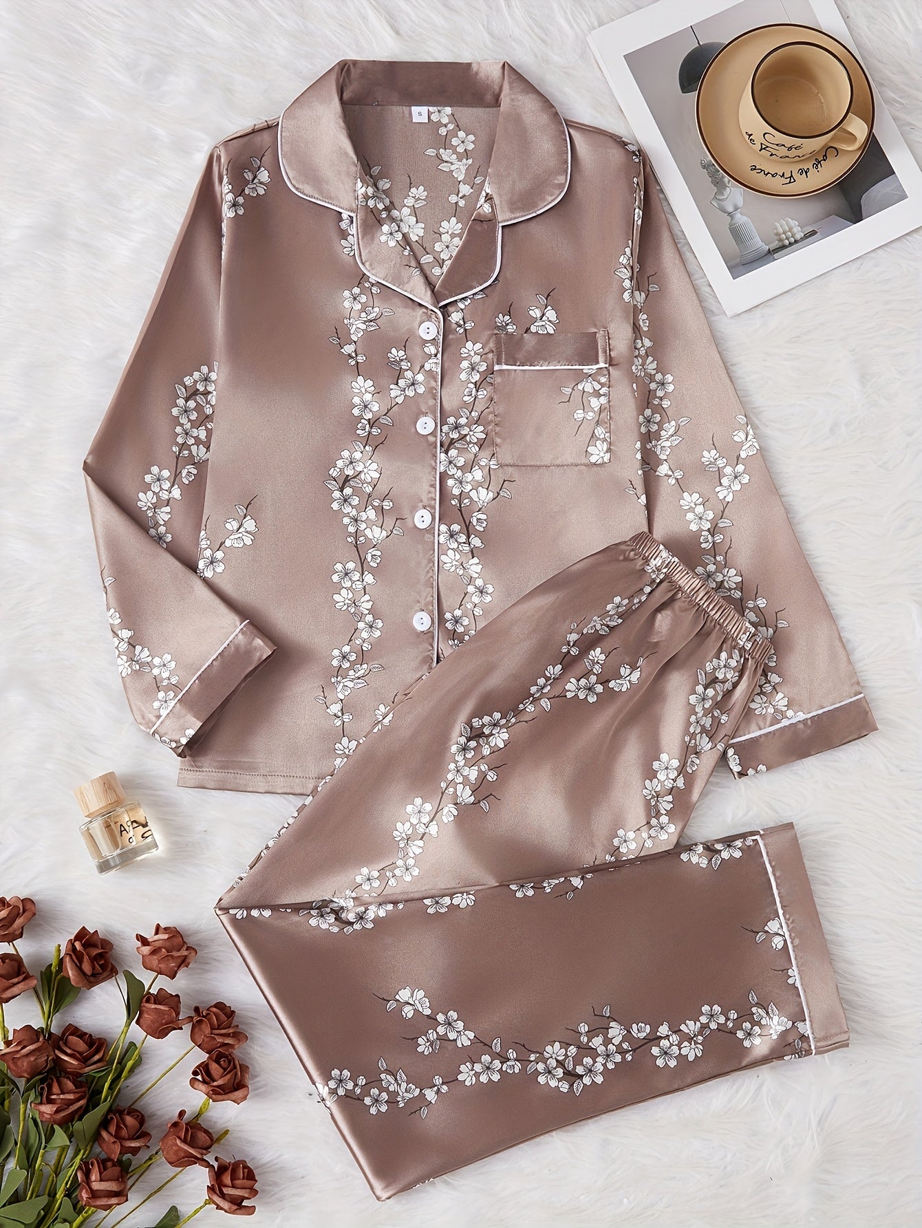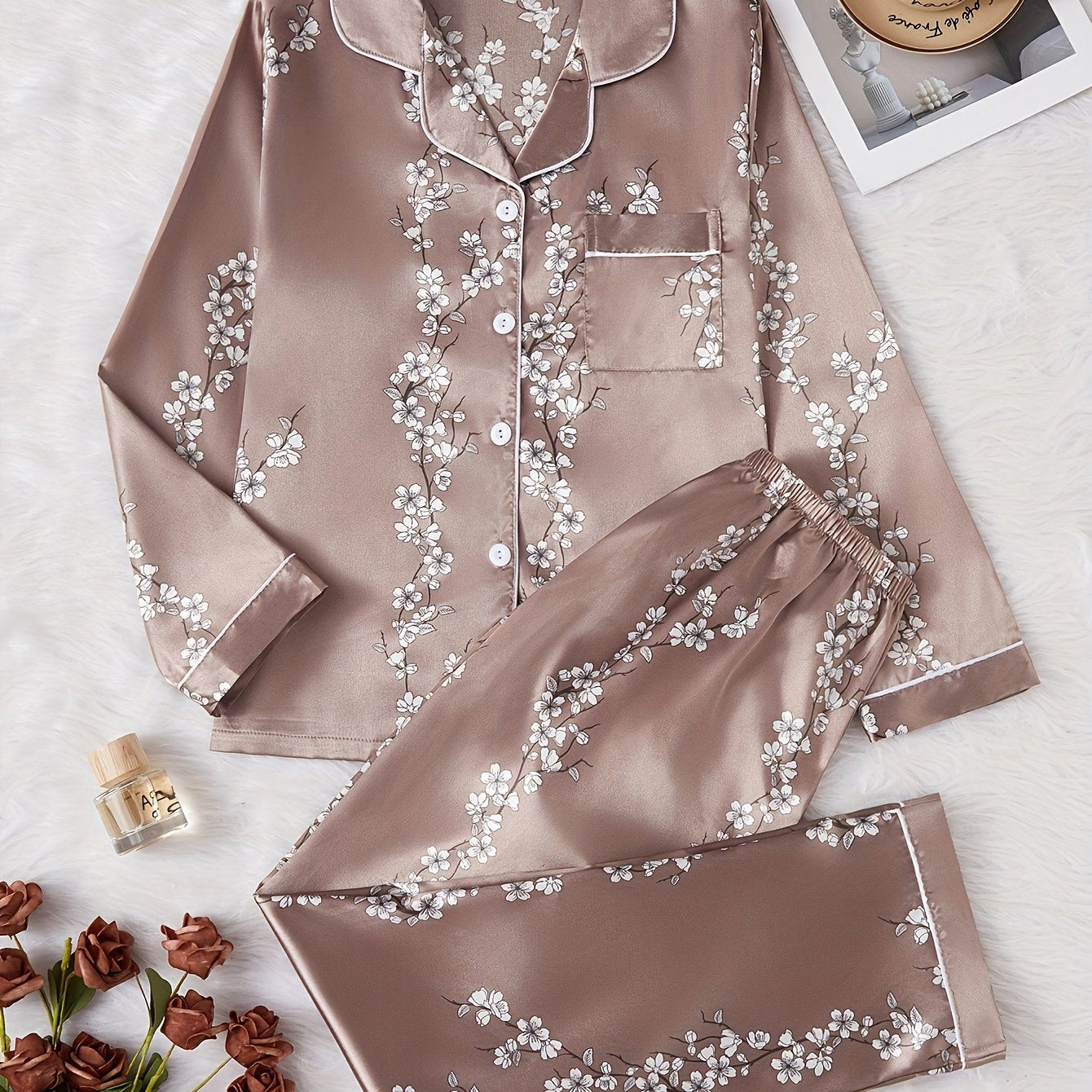 Women'S Vintage Elegant Floral Print Satin Pajama Set, Long Sleeve Top and Pants, Polyester 97% Elastane 3%, Lapel Collar, Woven, 90gsm, Fall/Winter Sleepwear