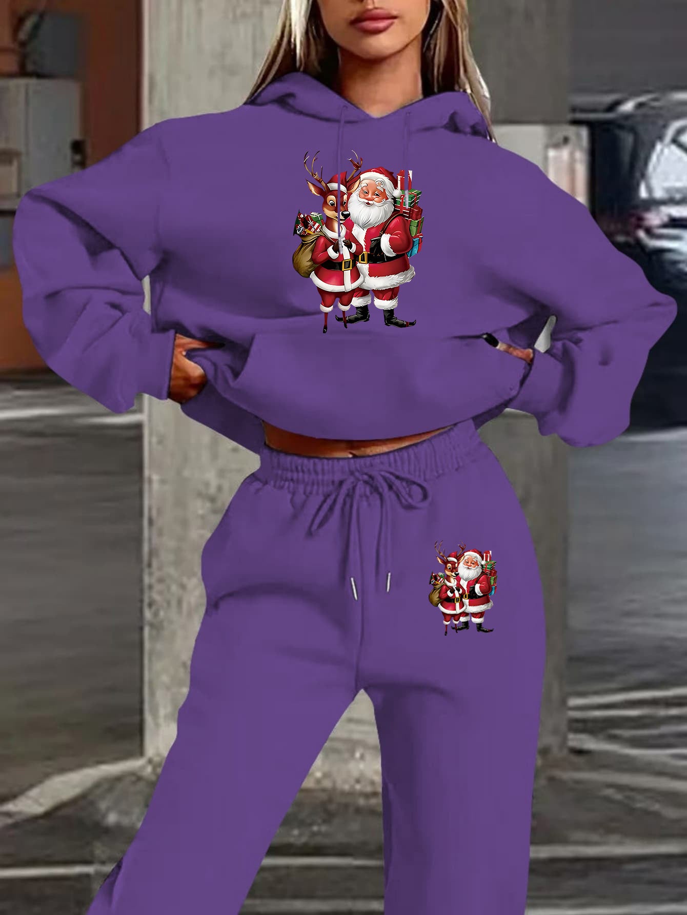 Women's winter clothing Santa Claus printed Women's velvet hooded sweater set