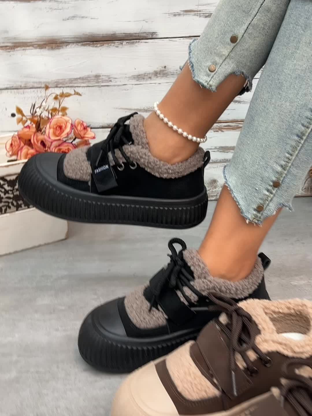 Women's Winter Plush Fleece-Lined Thermal Shoes - Upper & Rubber Sole Low-Top Ankle Boots with Faux Fur Collar, Brown/Beige/ Traction Tread for Cold Weather, Casual & Semi-Formal Outfits - Cozy Warm Winter Boots with Fleece L