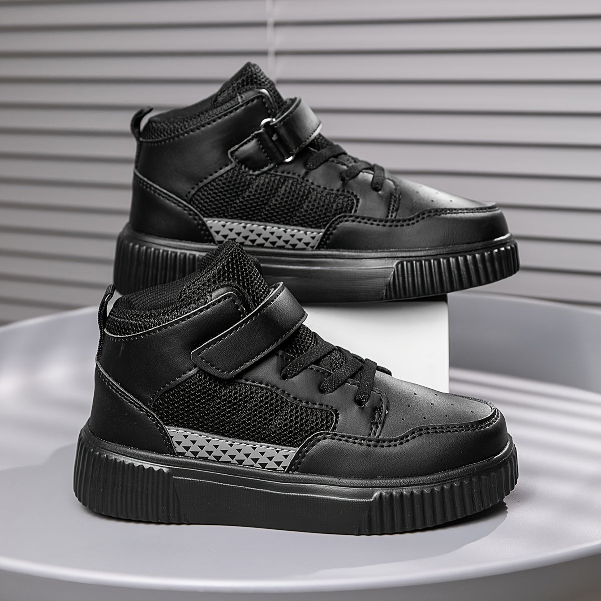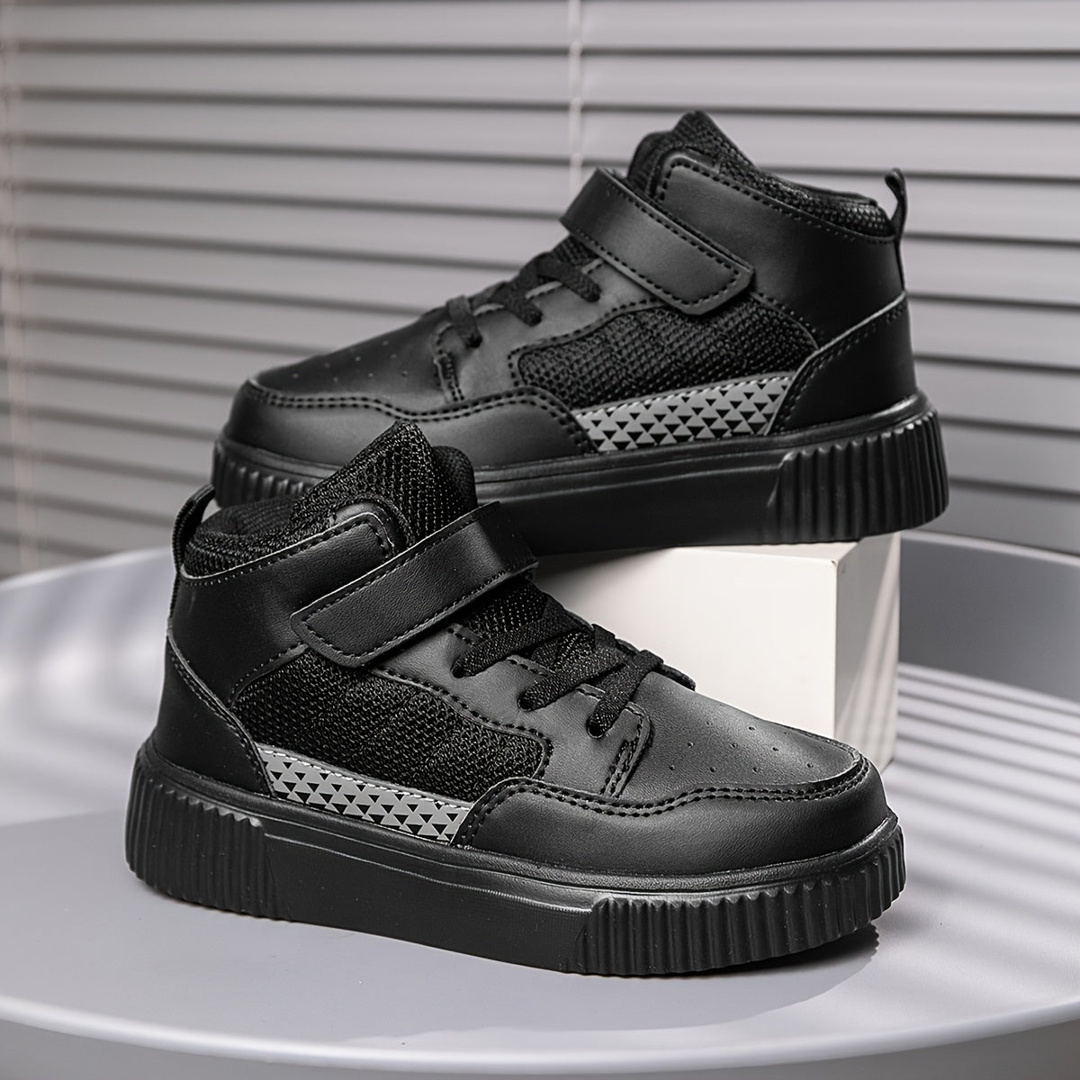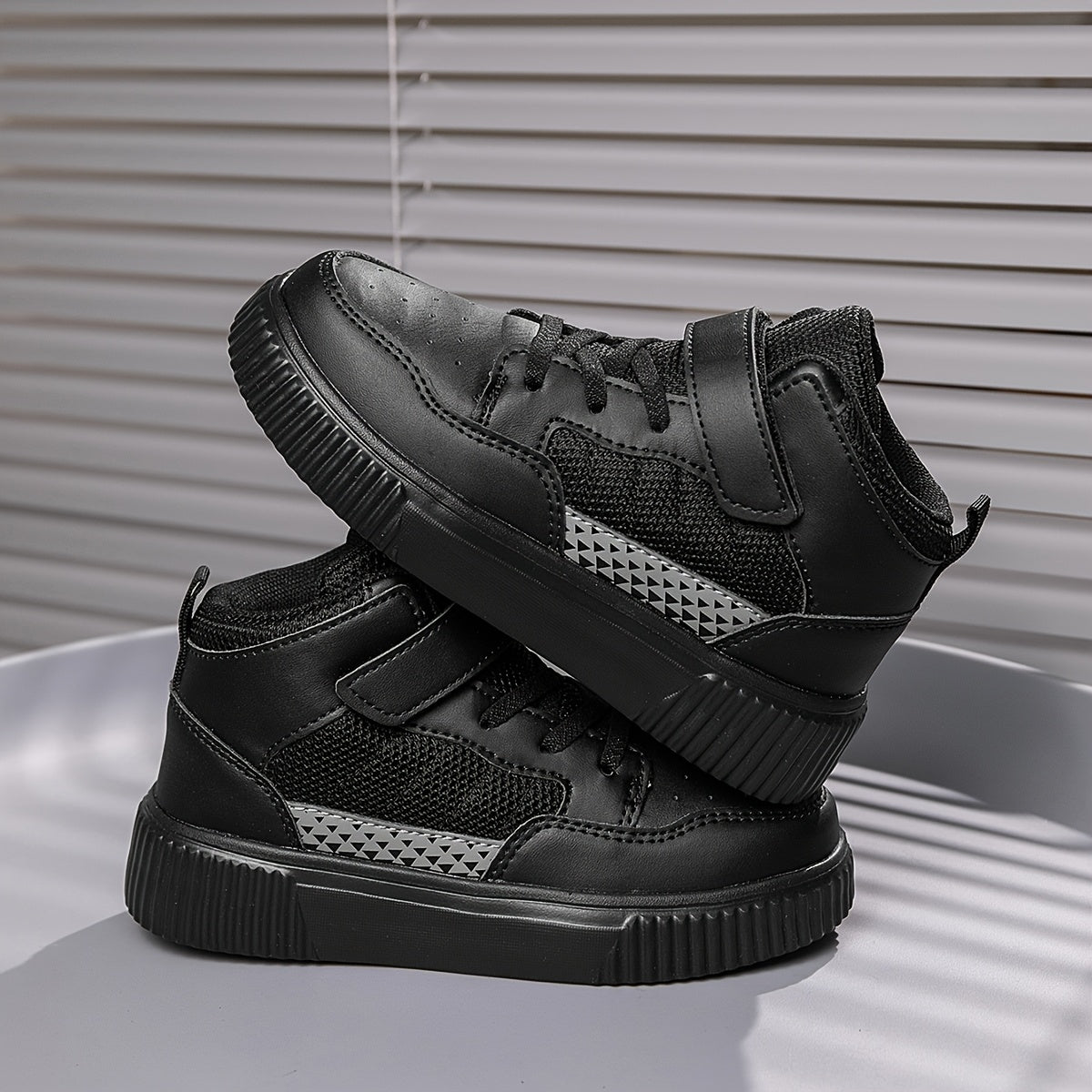 Youngsters' Black Mesh & PU High-Top Sneakers with Diamond Pattern - Breathable, Durable, Lightweight EVA Sole & Adjustable Hook-and-Loop Closure for School, Outdoor, Training - All-Season Versatile Play Shoes for Boys & Girl