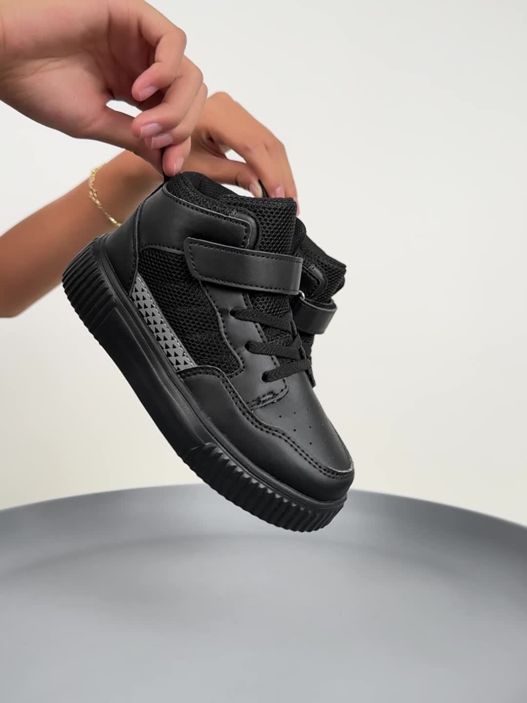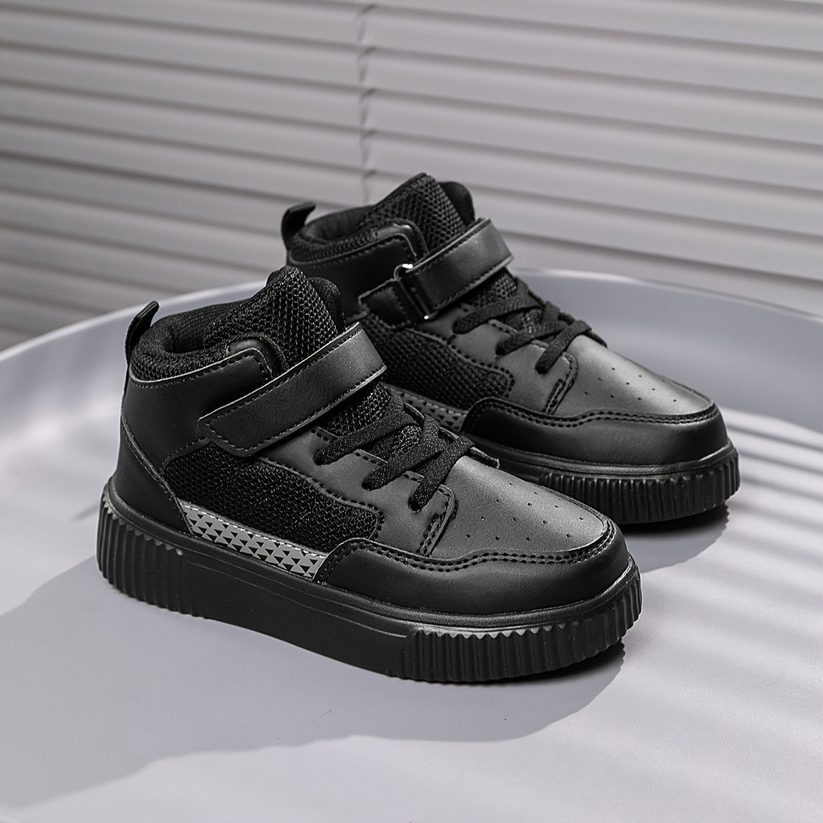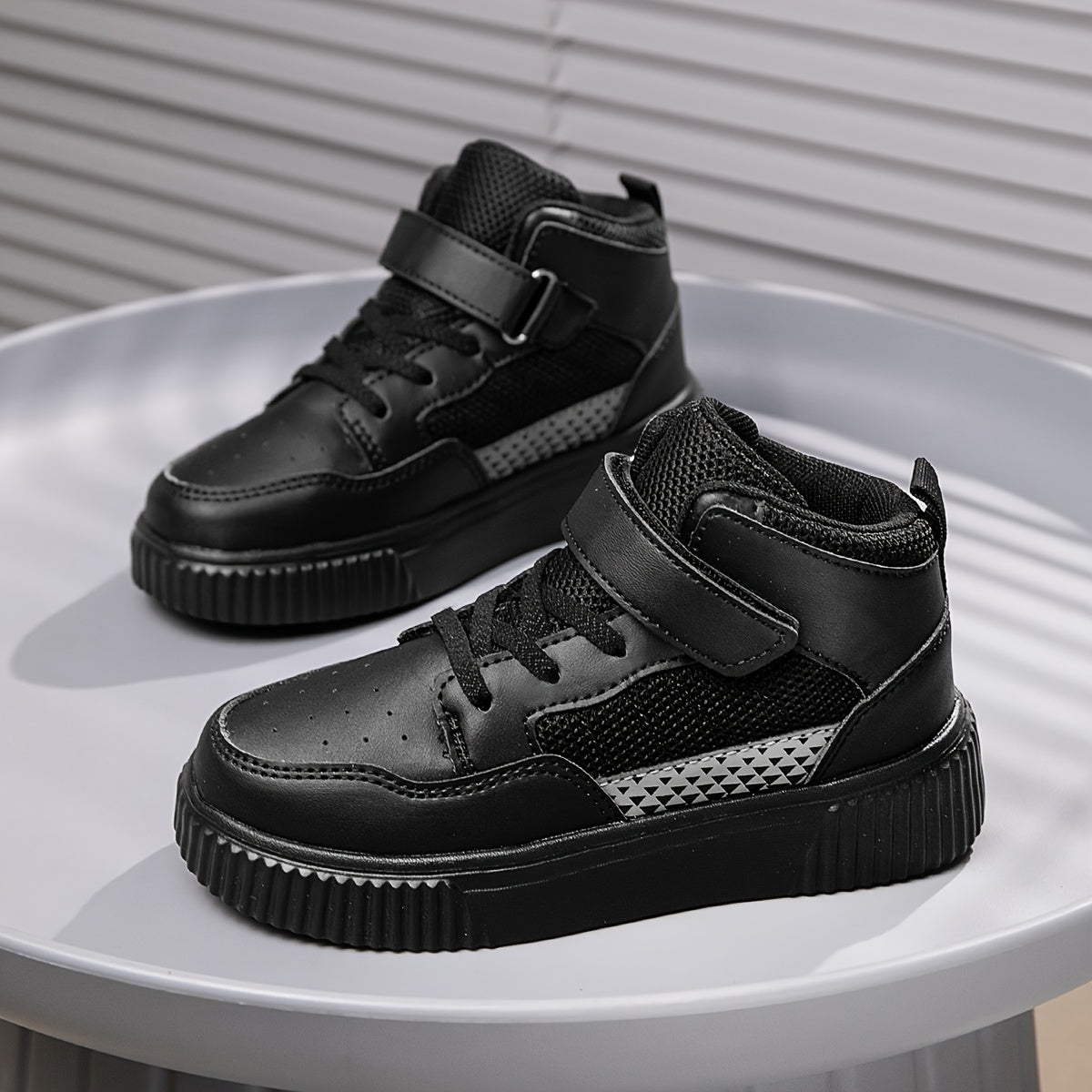 Youngsters' Black Mesh & PU High-Top Sneakers with Diamond Pattern - Breathable, Durable, Lightweight EVA Sole & Adjustable Hook-and-Loop Closure for School, Outdoor, Training - All-Season Versatile Play Shoes for Boys & Girl