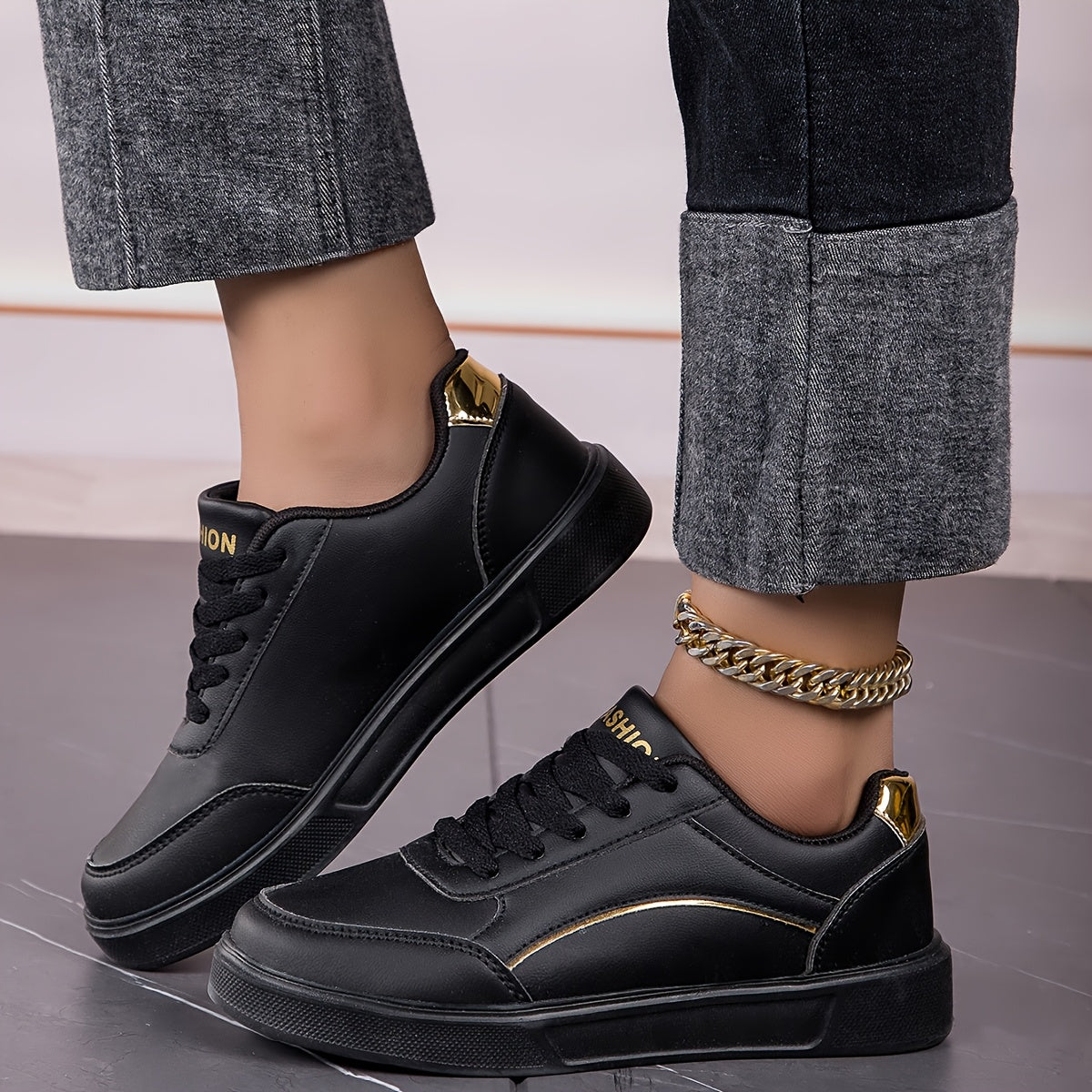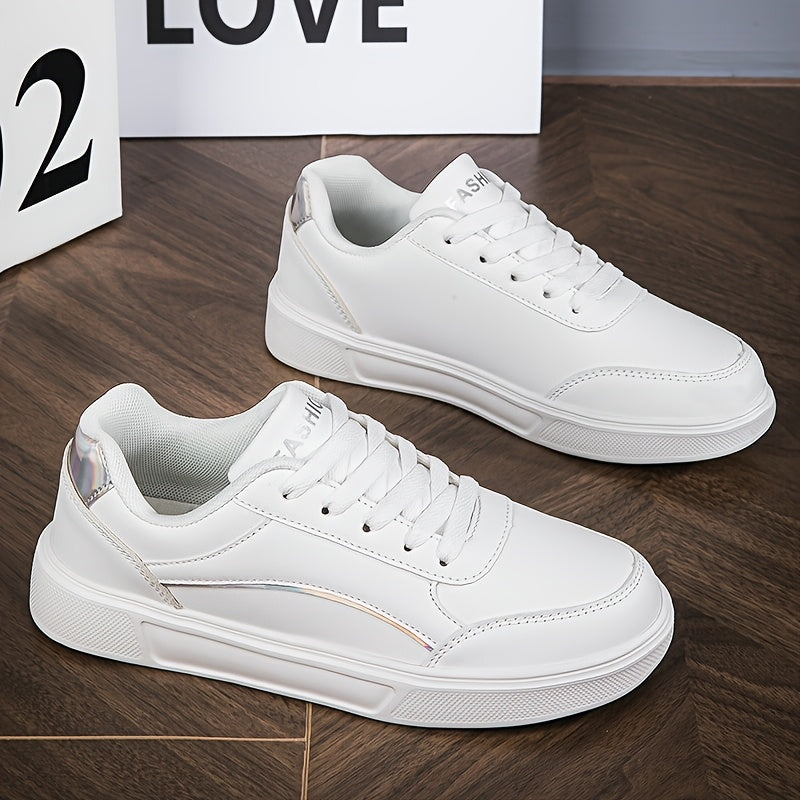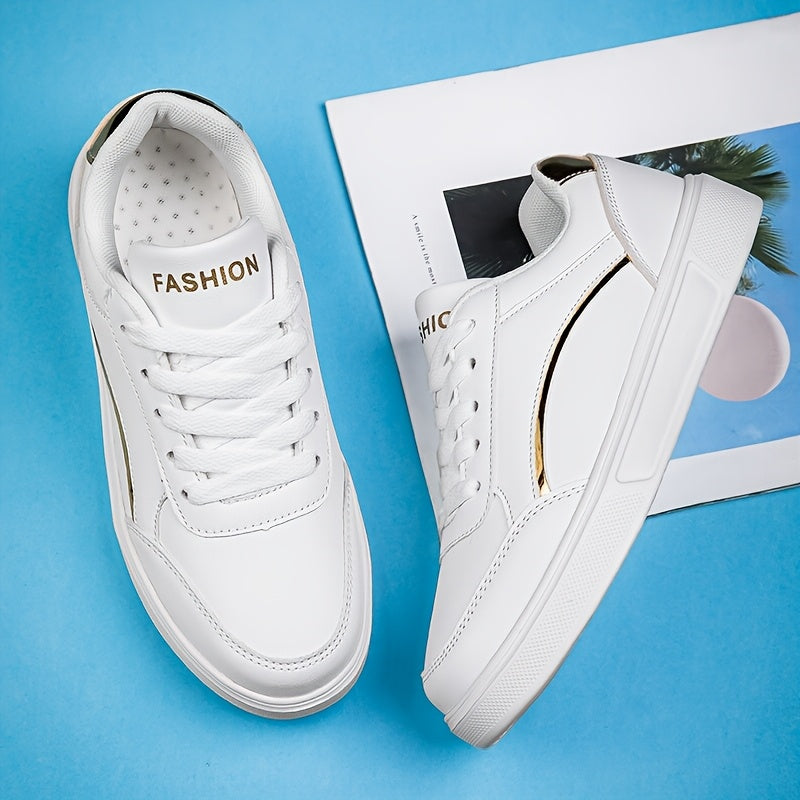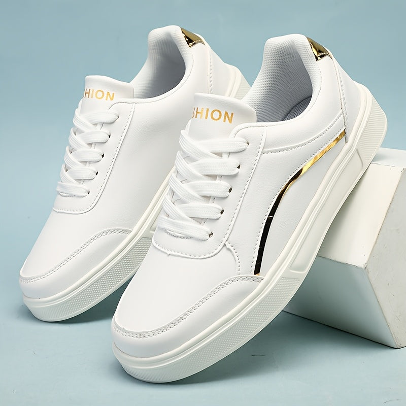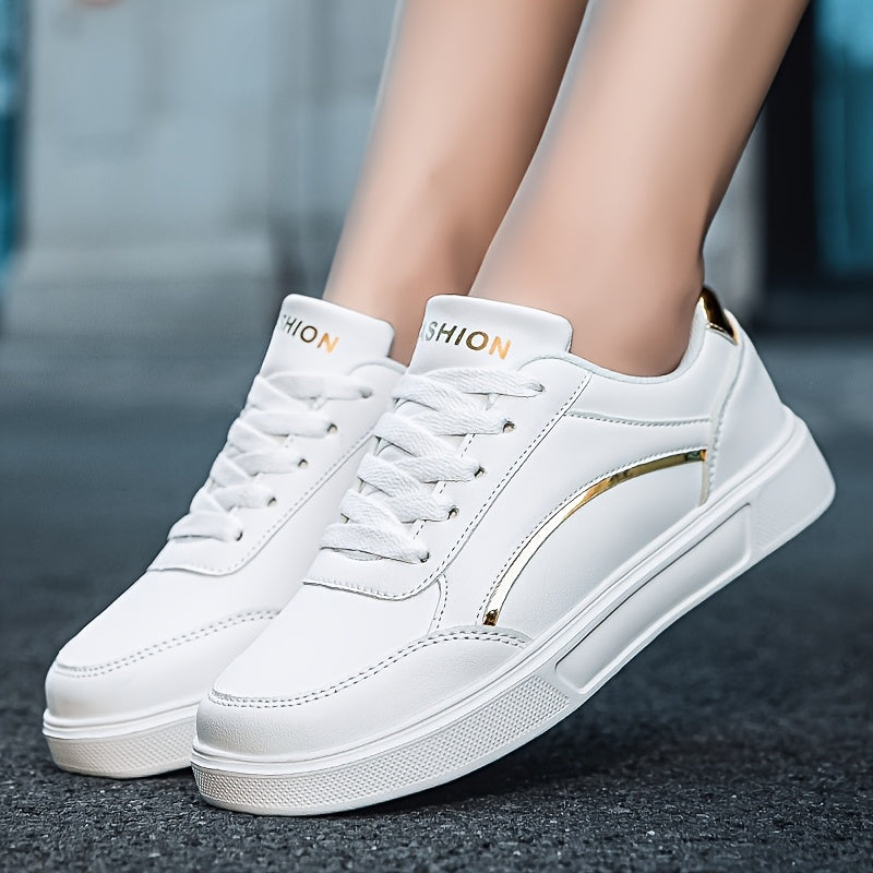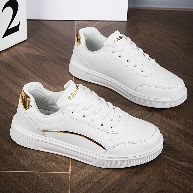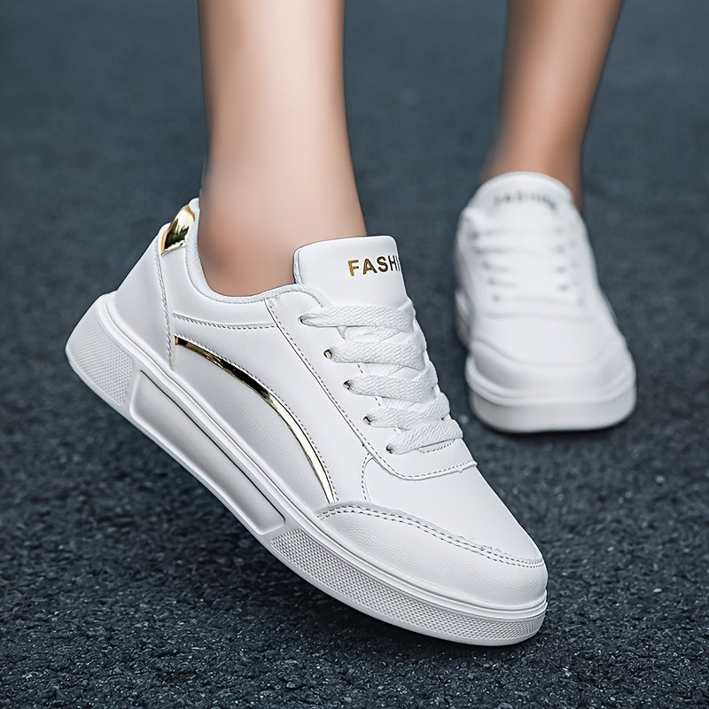 Youngsters' Fashion Sneakers - White PU Upper with Golden Accents, Comfortable & Lightweight Casual Running Shoes for Boys and Girls, All-Season Wear, Low-Top Lace-Up Design, Outdoor Youngsters's Footwear | Fabric Lined Inter